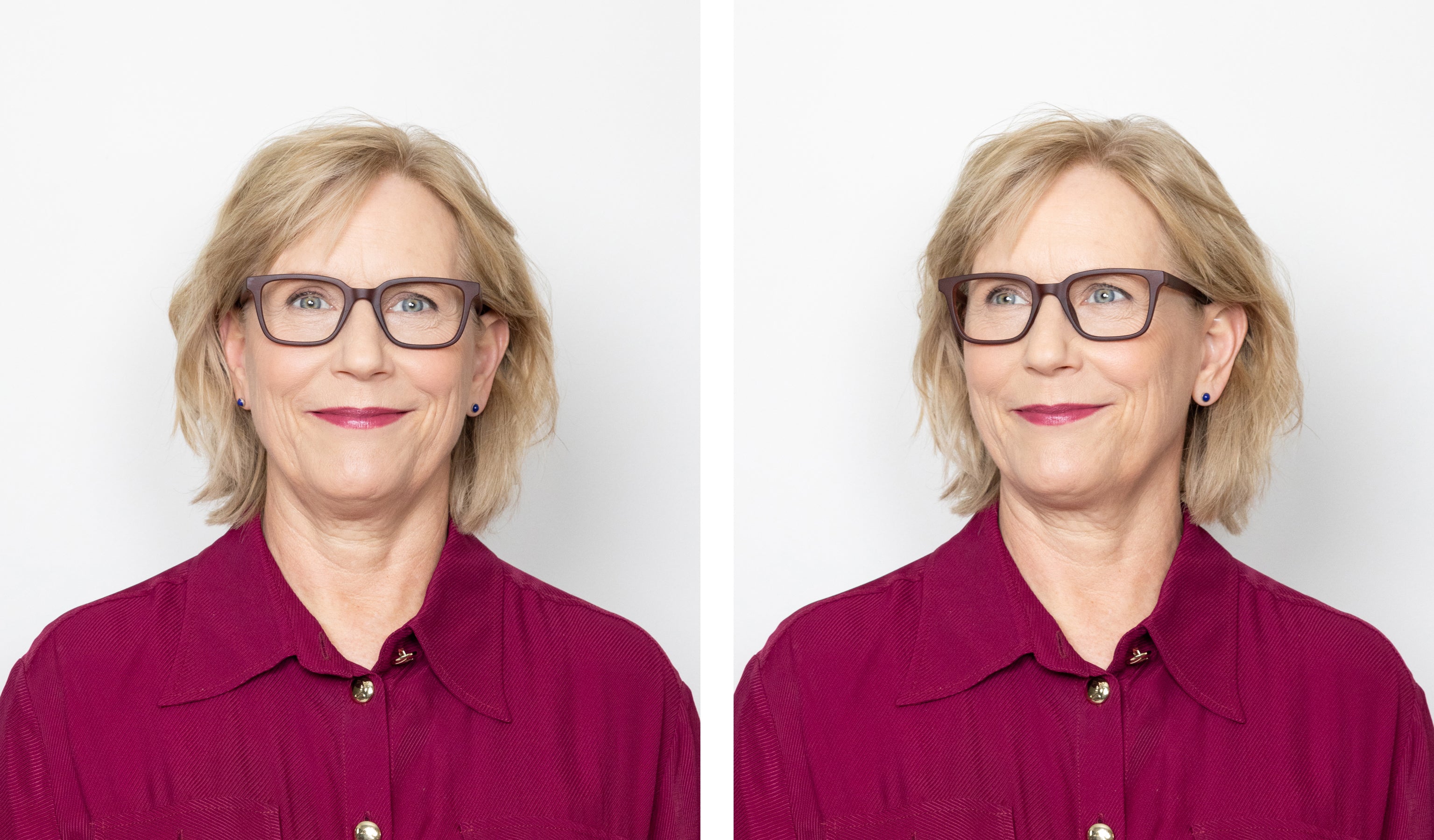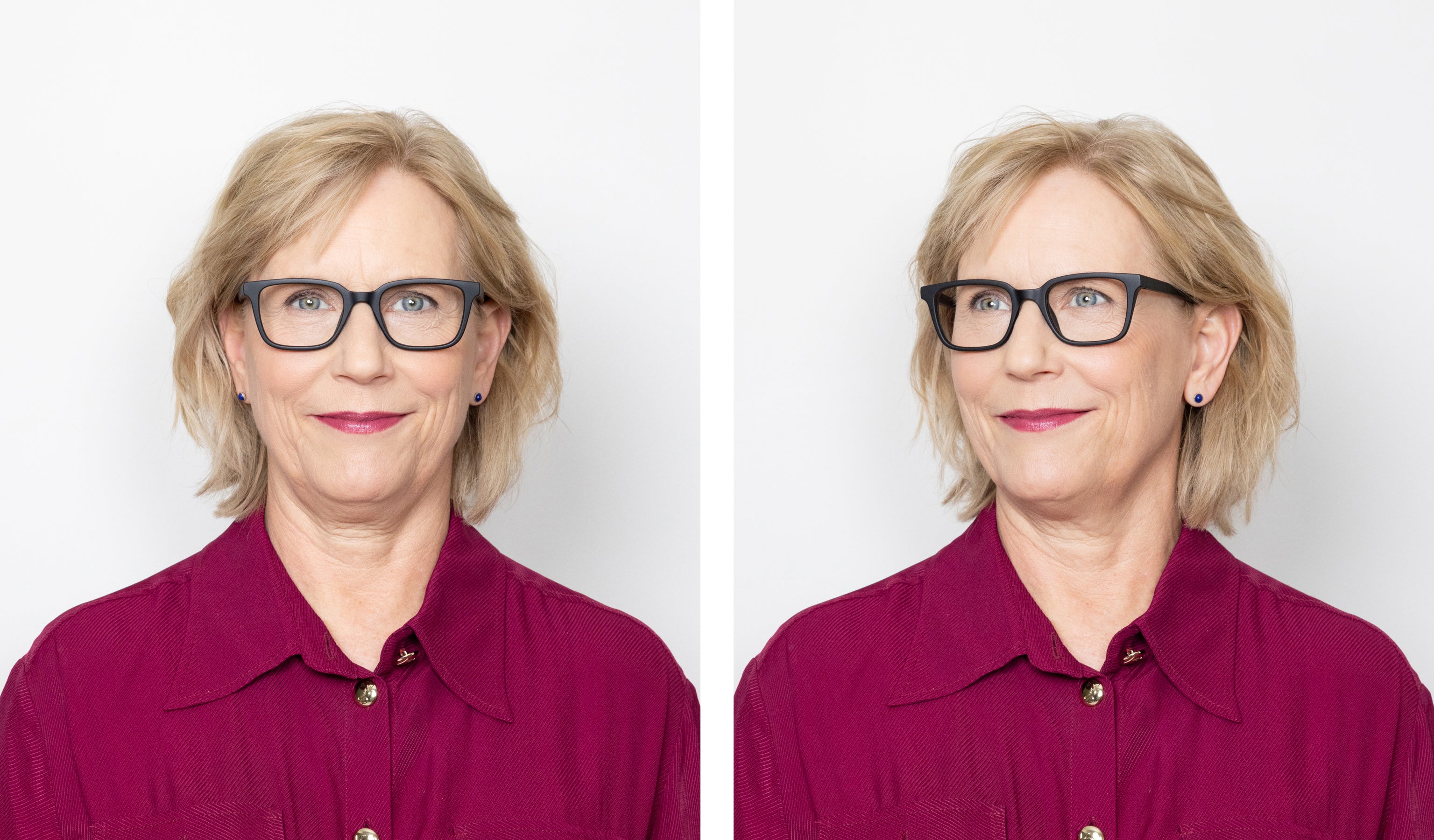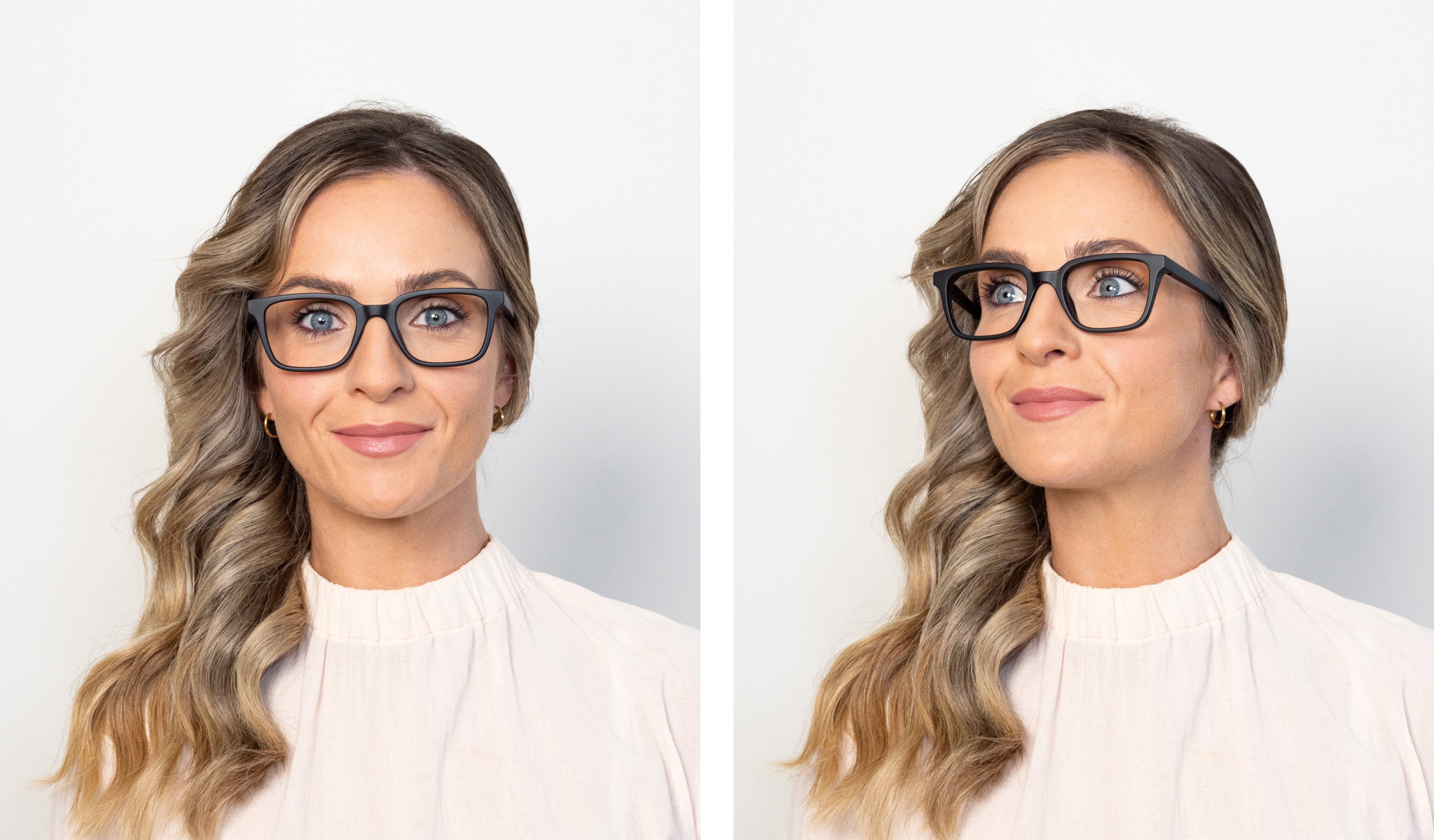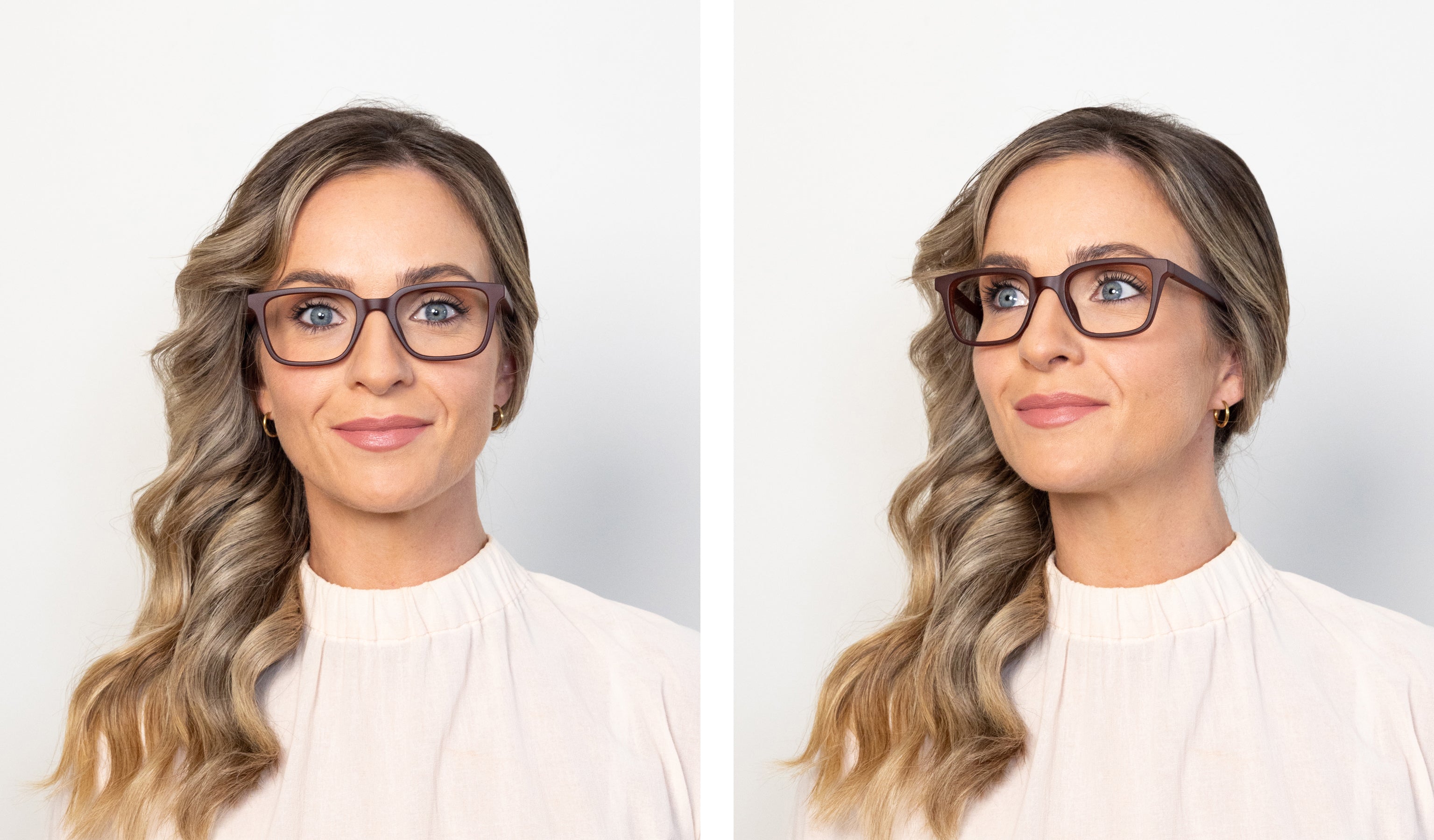 "I have always gone for a more rounded, darker frame so I was really surprised to find the light pink, rectangle frame also suited me." -Claire Hall